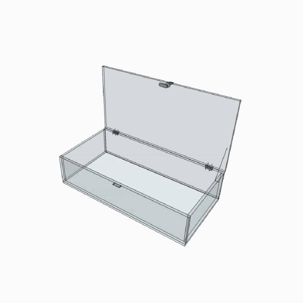 Petite boite vitrine transparente en plexiglass. D’une hauteur de 15 cm, d’une longueur de 60 cm et d’une largeur de 30 cm.