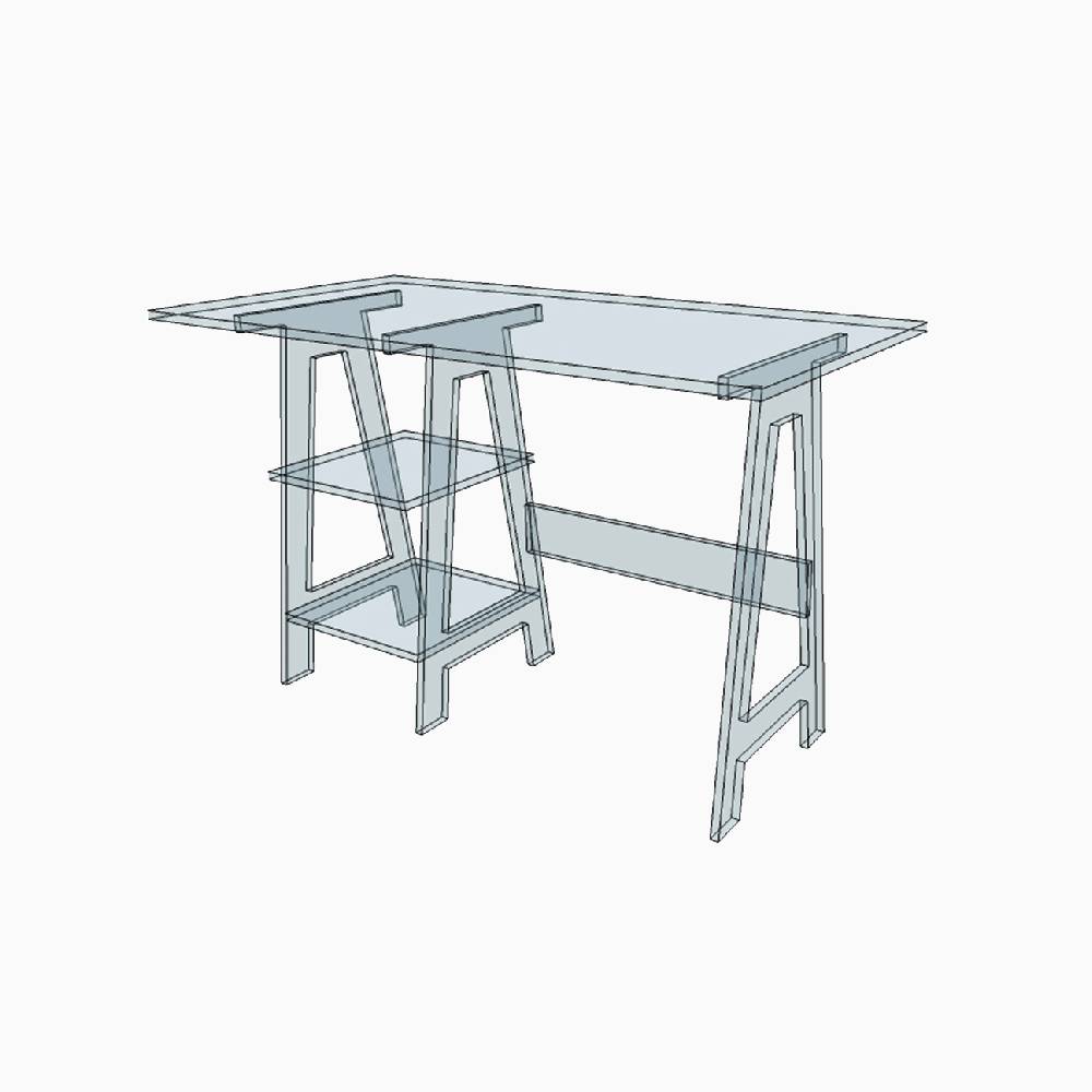 Magnifique bureau chic et transparent en Plexiglass, d’une hauteur de 74,5 cm, d’une longueur de 120 cm et d’une largeur de 60 cm.