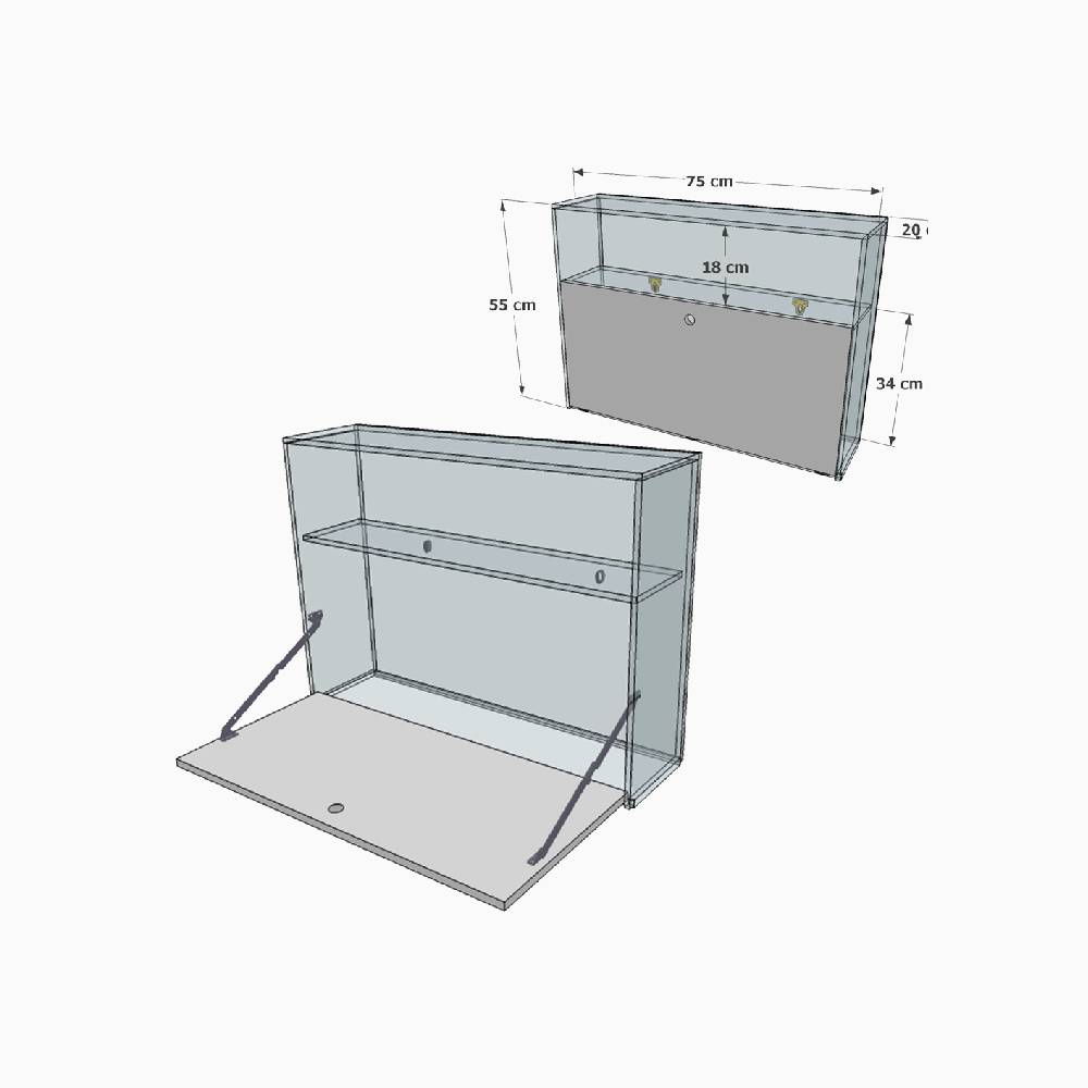 Petit bureau mural pliable en Plexiglass transparent avec plateau pliable, d’une hauteur de 55 cm, d’une longueur de 75 cm et d’une largeur de 20 cm. En plexiglass transparent et dépoli (plateau à rabat) de 1,5 cm d’épaisseur (15 mm), il est équipé d’un plateau rabattable à volonté pour ouvrir et fermer votre bureau d’appoint grâce à son passe doigt. Il trouve aisément sa place dans votre bureau, dans la chambre d’un adolescent, dans votre salon ou tout autre endroit de votre convenance. Profitez d’une surface de travail pratique et compacte. Ce meuble est composé d’un plexiglass de qualité qui ne jaunit pas, solide et durable dans le temps. Le bureau dispose de 2 compartiments de rangement pour votre matériel. Une fois ouvert, la surface de travail disponible est de profondeur.