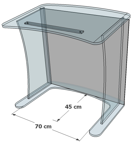 Petit bureau pupitre en Plexiglass transparent spécialement adapté aux personnes à mobilité réduite, d’une hauteur de 90 cm à son poignet le plus haut (79 cm au plus bas), d’une longueur de 90 cm et d’une largeur de 56 cm.