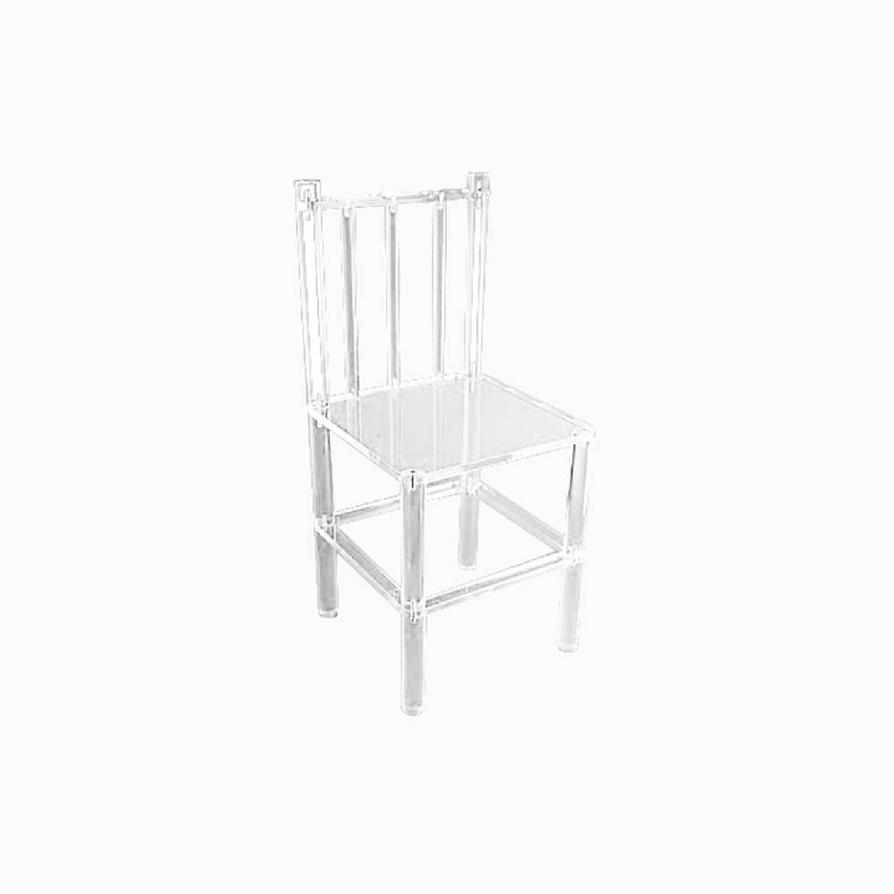 Chaise à barreaux en plexiglass transparent, d’une hauteur totale de 80 cm et pour un assise de 45 cm, et d’une longueur et d’une largeur de 40 cm.
