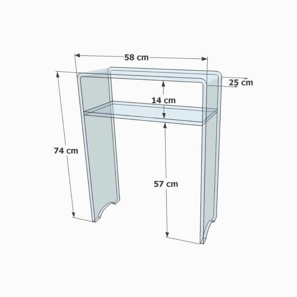 Petite console pont en Plexiglass transparent d’une hauteur de 74 cm pour une longueur de 58 cm et une largeur de 25 cm. Petite console en plexiglass de 1,5 cm d’épaisseur (15 mm). En utilisation intérieure, cette console vide poche transparente apporte un style chic et luxueux à votre décoration. Elle trouve aisément sa place dans votre couloir près de la porte d’entrée, dans votre bureau ou même dans votre salon par exemple. Ce meuble est composé de plexiglass de qualité, solide et durable dans le temps. D’un poids plume de 9 kg, cette console transparente est facilement mobile.