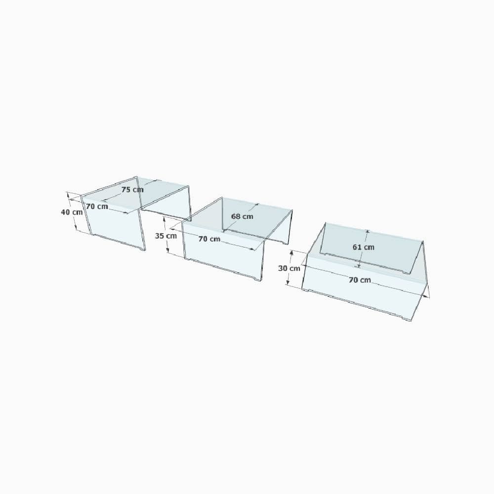 Ensemble de 3 petites tables basses de salon rectangulaire en Plexiglass. Les 3 tables font respectivement de 40 cm, 35 cm et 30 cm de hauteur, 75 cm, 68 cm et 61 cm de longueur pour 70 cm de largeur. Ces 3 tables basses en plexiglass transparent ont une épaisseur de 1,5 cm (15 mm). Elles trouvent parfaitement leur place dans votre salon sans perte d’espace. Cet article apporte un style moderne et épuré à votre décoration tout en étant compacte grâce à leur capacité à s’encastrer les une dans les autres. Le plexiglass utilisé est de qualité et ne jaunit pas.