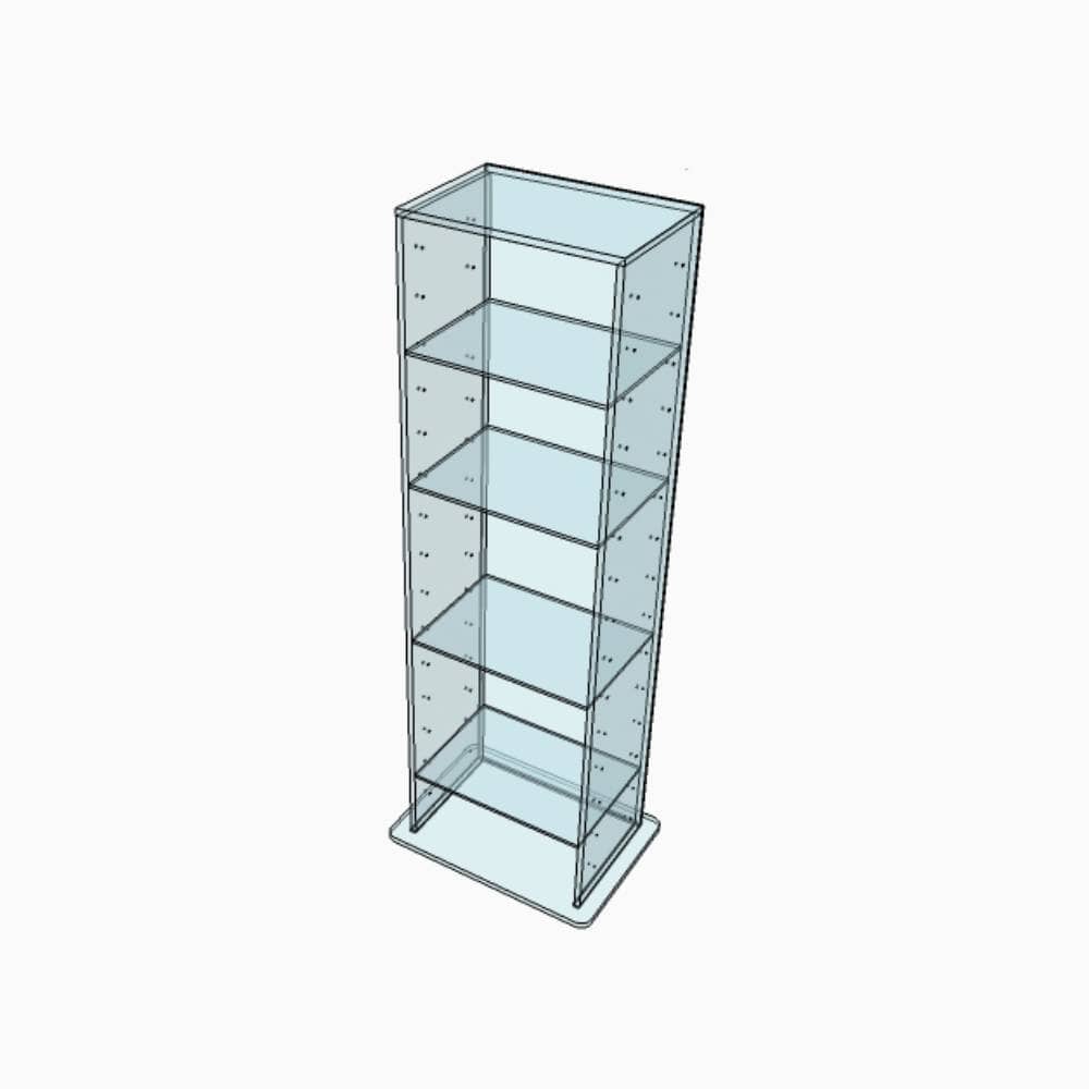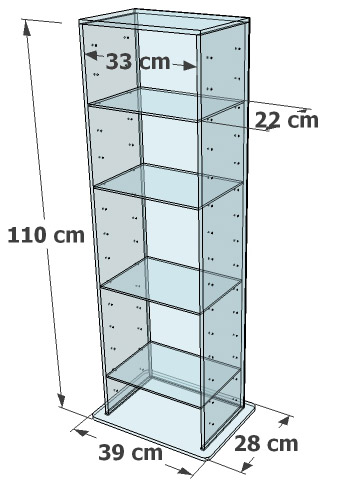 Petite étagère transparente en plexiglass. Base du meuble d’une longueur de 39 et d’une largeur de 28 cm. Le meuble en lui-même est d’une hauteur de 110 cm, d’une longueur de 33 et d’une largeur de 22 cm.