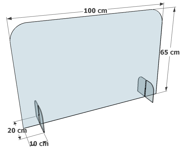 Protection pour tables et bureaux en plexiglass transparent, d’une hauteur de 65 cm, d’une longueur de 100 cm, soutenu par 2 pieds d’une profondeur de 20 cm.