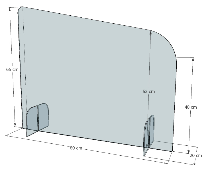 Séparateur de bureau en plexiglass transparent, d’une hauteur de 65 cm à son point le plus haut et de 40 cm au plus bas, d’une longueur de 80 cm et d’une épaisseur de 4 mm.