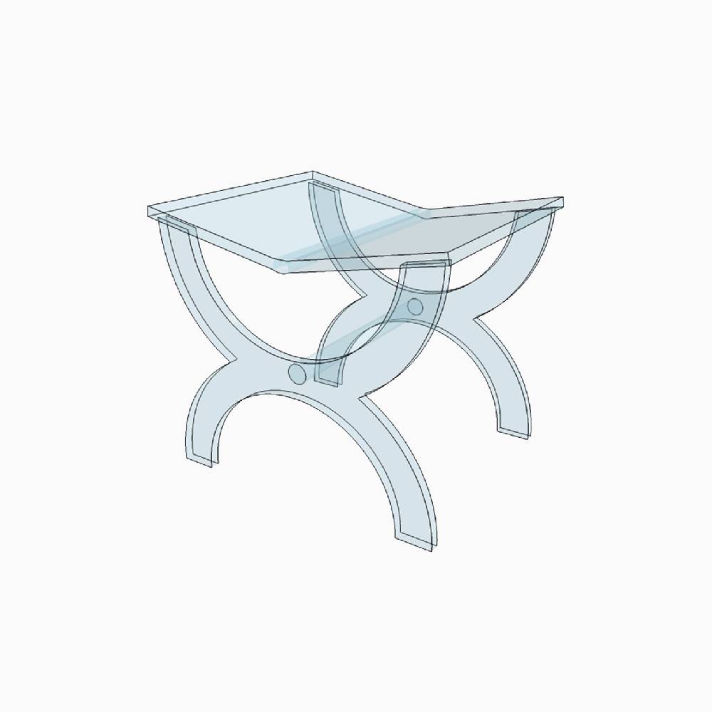 Siège curule transparent en plexiglass à la romaine, d’une hauteur de 41 cm, d’une longueur 45 cm et d’une largeur de 40 cm.