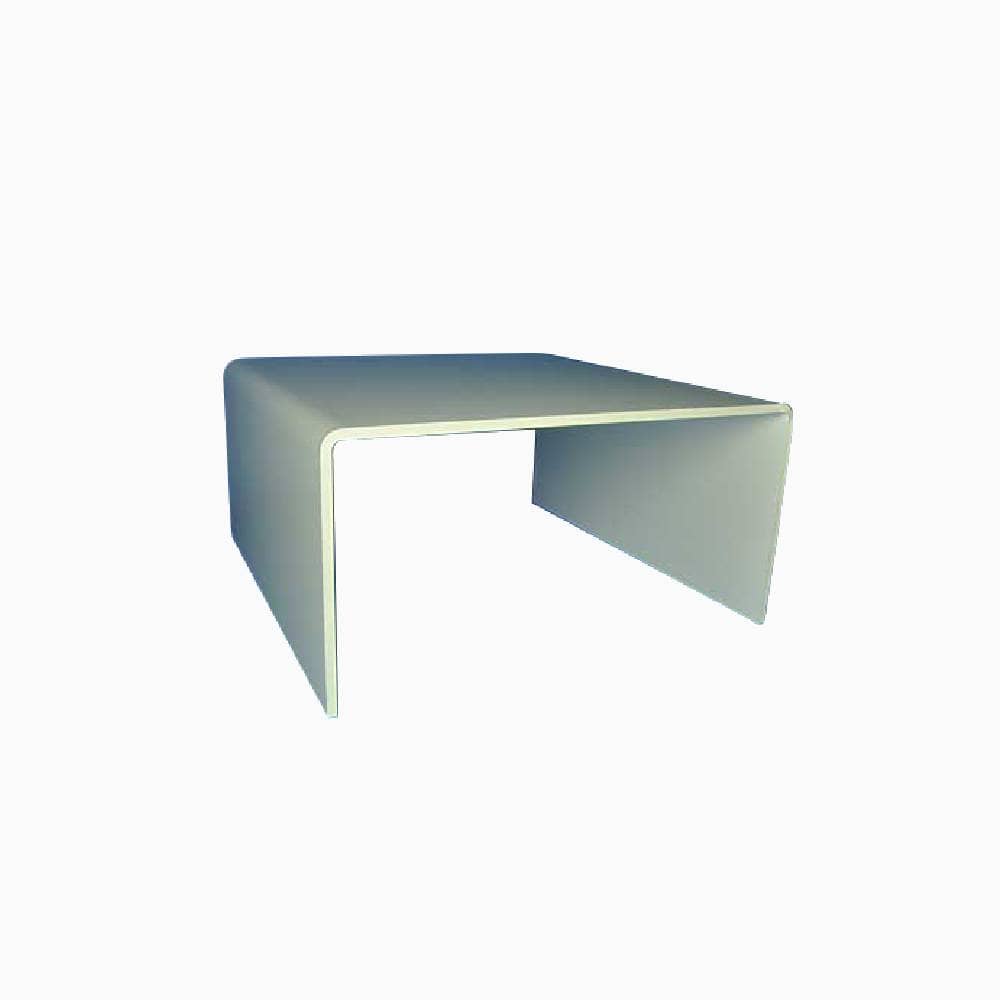 Table basse pont en Plexiglass blanc brillant (satiné) d’une hauteur de 40 cm pour une longueur de 80 cm et unelargeur de 80 cm.