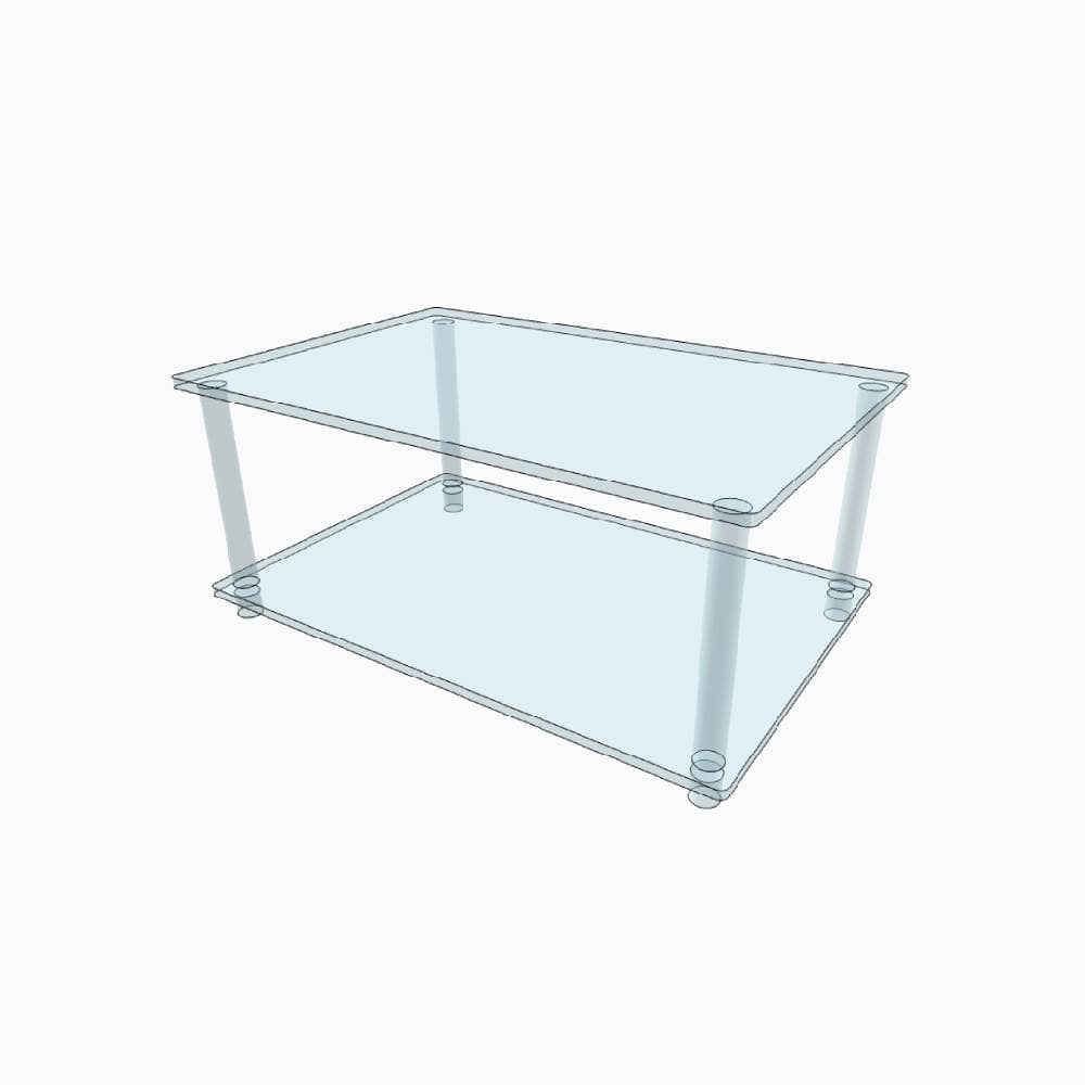 Petite table basse en pont en Plexiglass transparent d’une longueur de 90 cm, une largeur de 60 cm et d’une hauteur de 40 cm.