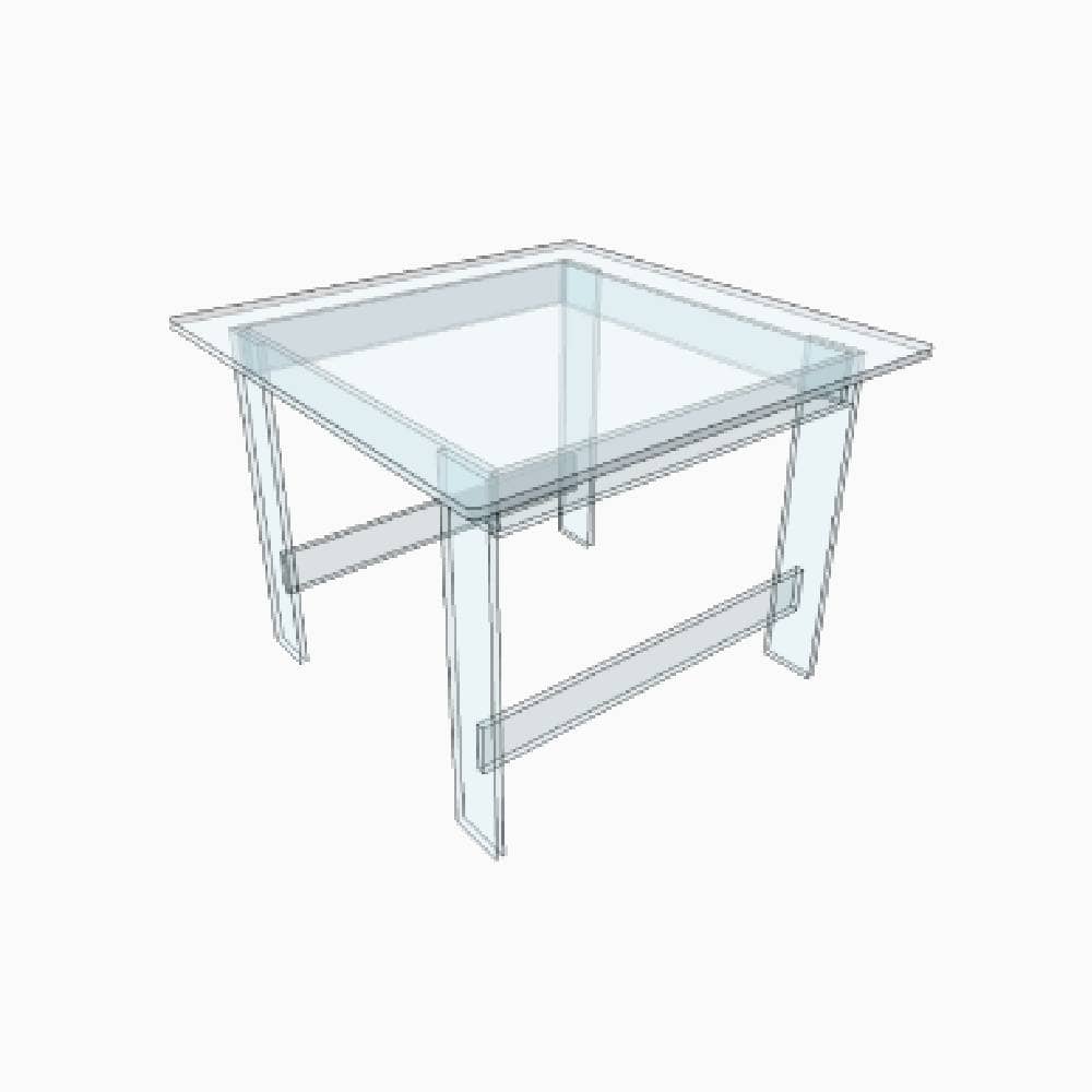 Table de repas carrée en Plexiglass transparent d’une hauteur de 73 cm pour une longueur de 100 cm et une largeur de 100 cm.