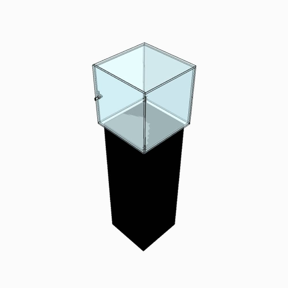 Petite vitrine transparente en plexiglass montée sur socle noir. D’une hauteur totale de 140 cm, d’une longueur de 40 cm et d’une largeur de 40 cm.